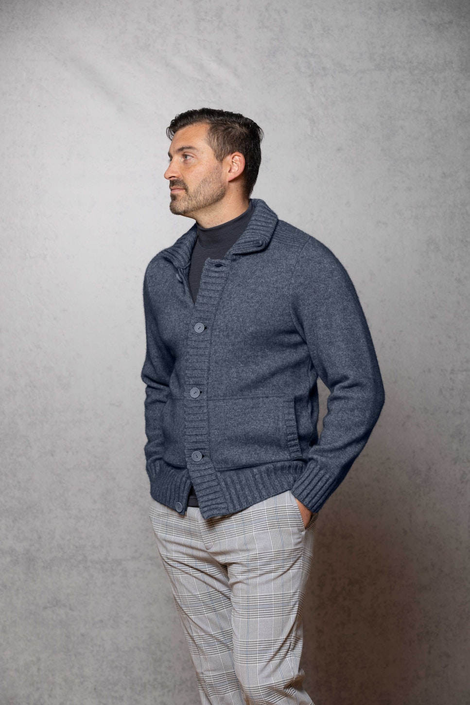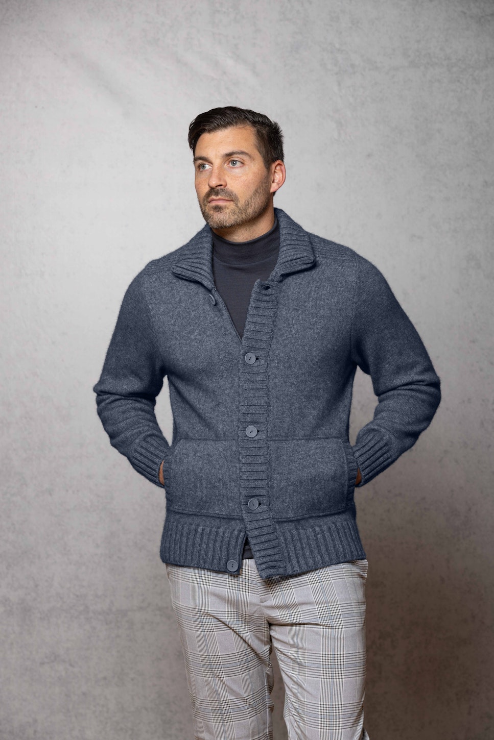 The ultimate garment in Possum Merino, heavyweight single jersey knit high collar, full zip and button-through wind break trim. Side pockets and deep rib cuffs and bands.