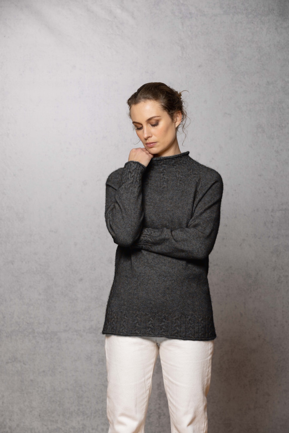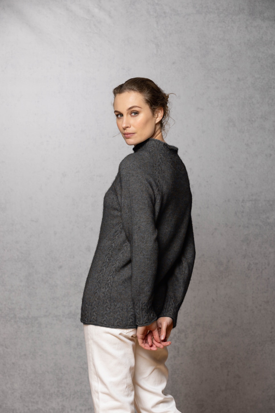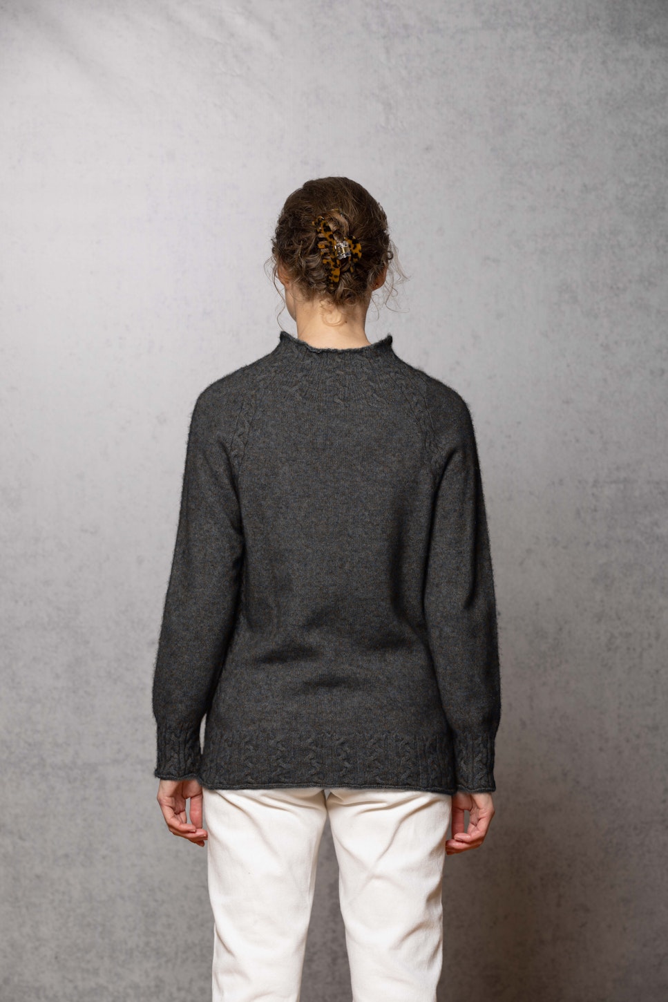 This sweater has fine cable detail on the cuffs, bottom waistband and