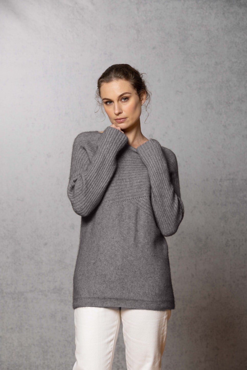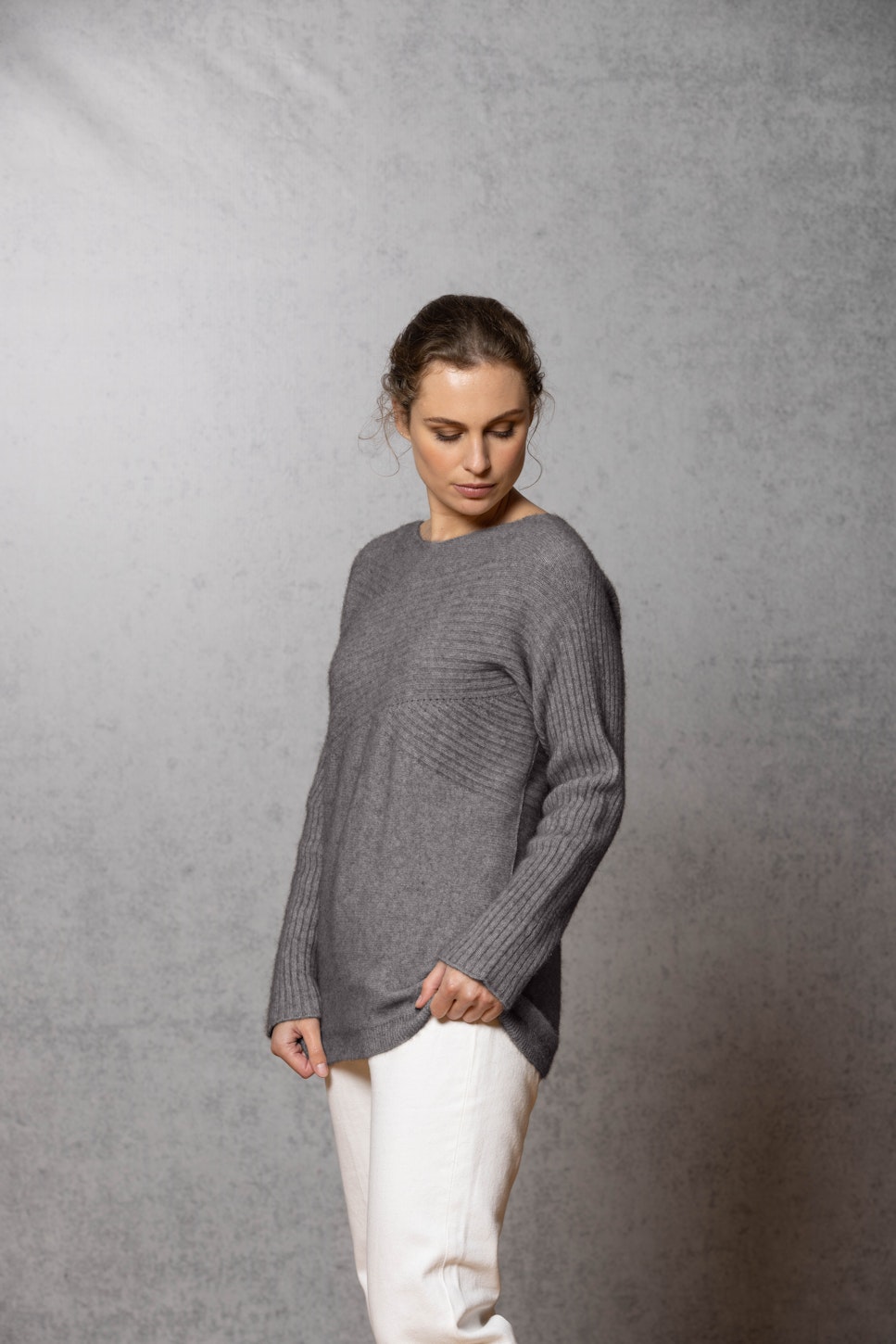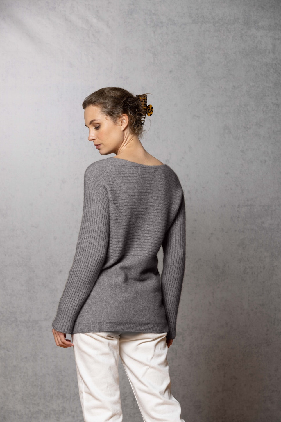 Fashion fitted style, relaxed wide neck with crossover rib detail on body and sleeves. WholeGarment seamless construction.