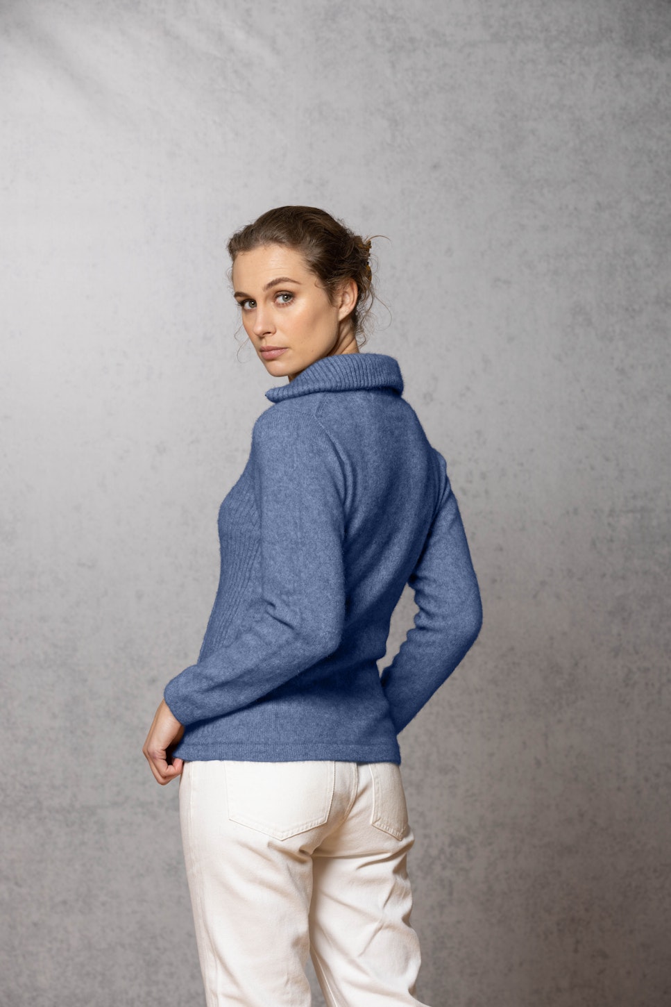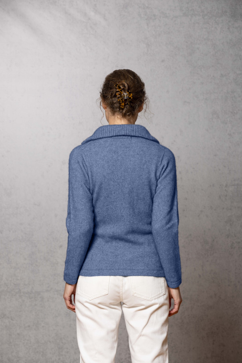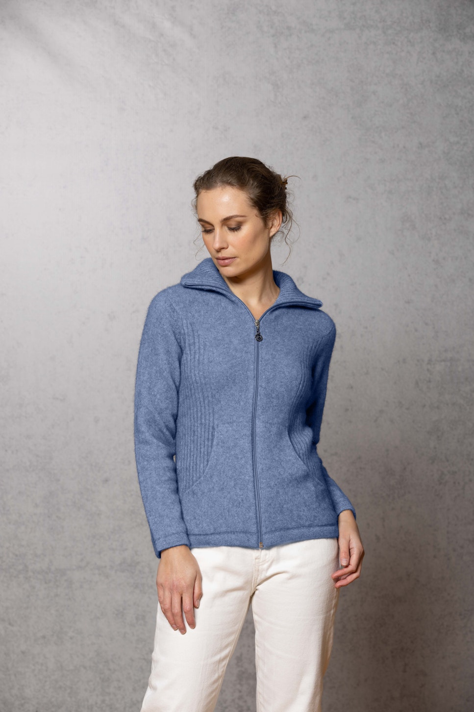 The ultimate in comfort, this style offers full zip, integrated pockets, turndown rib collar that can be zipped right up, ribbed side panels. WholeGarment seamless construction.